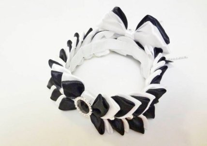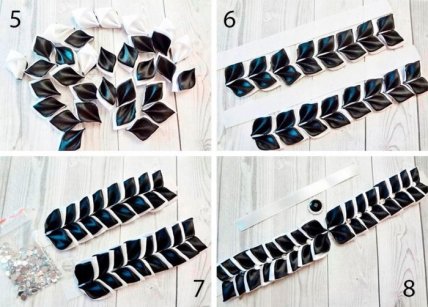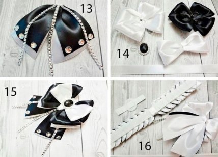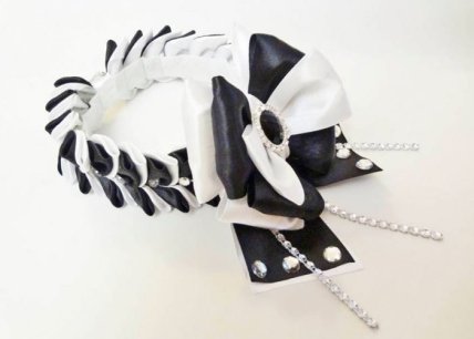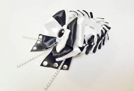Соберите бант: возьмите заготовку со стразовыми цепочками и прикрепите к ней белый бант их 4х петель. Сверху прикрепите чёрный бант и маленький белый бантик. Обвяжите по центру белой ленточкой и приклейте чёрный кристалл.