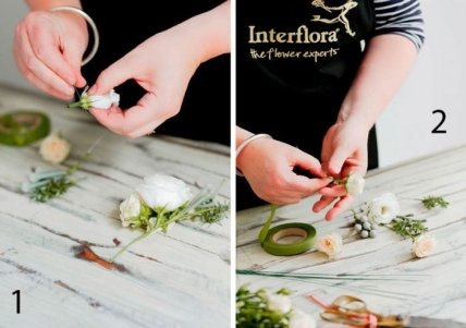 Подготовьте бутоны цветов.Проденьте отрезок флористической проволоки через основание бутона, согните пополам и закрутите. Проделайте этот процесс со всеми бутонами.