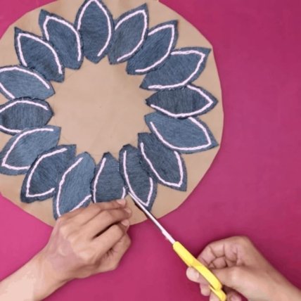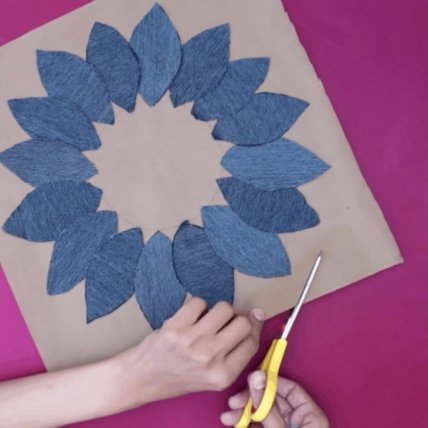 На куске ткани, которая станет основой для коврика, обозначаем окружность, а затем выкладываем лепестки по кругу и фиксируем их при помощи клеевого пистолета. Лепестки должны слегка заходить один на другой. Последний лепесток заводим под первый, чтобы не нарушать рисунок. Для удобства обрезаем лишнюю ткань.