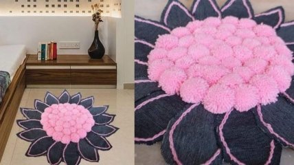 Интересный внешне, практичный прикроватный коврик легко сделать имея немного подходящей пряжи и старые джинсы.