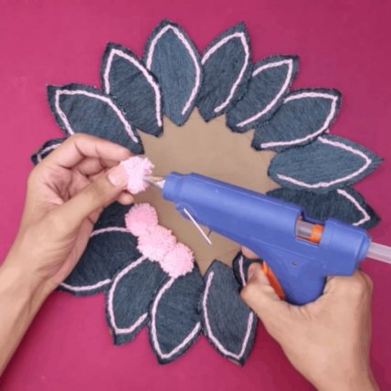Последний этап — создание сердцевины. Помпоны приклеиваем по кругу вплотную один к другому. Направление работы: от основания лепестков к центру.