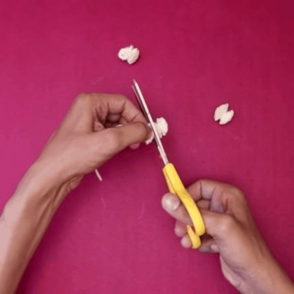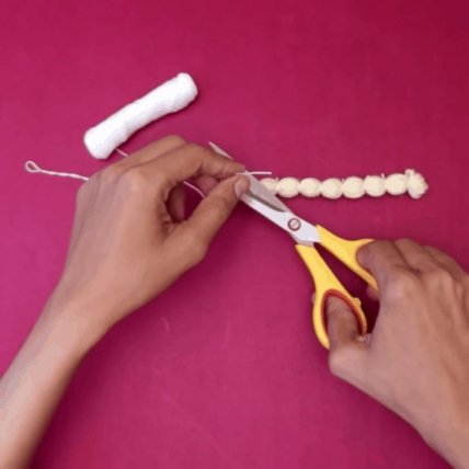 Разрезаем косу по центру горошин и получаем помпоны, которые остается лишь распушить.