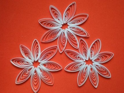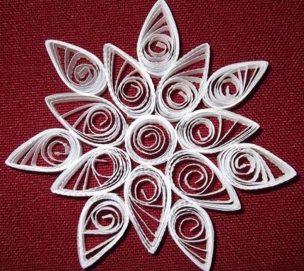 Дальше создаем несколько модулей глаза, и выкладываем их вокруг одной спирали и склеиваем их. К вершине снежинки приклеиваем тугую спиральку – это окончательный этап создания.