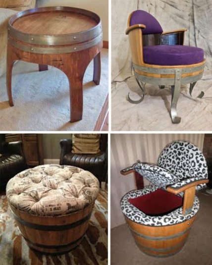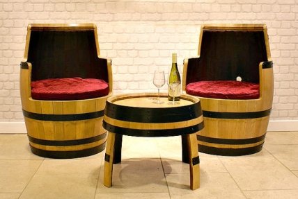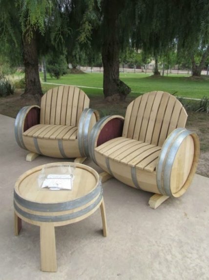 Прекрасный пример превращения ненужных деревянных бочек в оригинальный комплект мебели для гостиной.