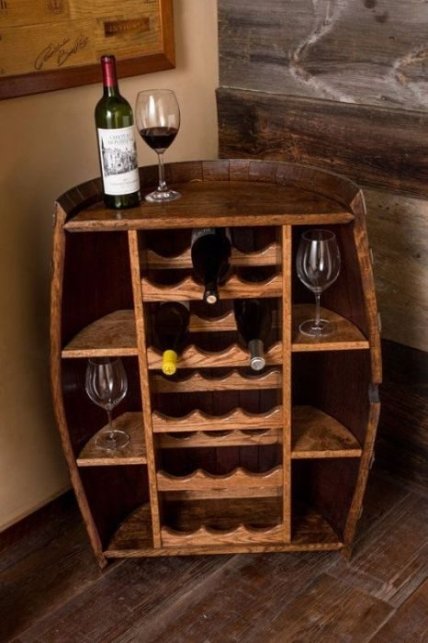Красивый и вместительный открытый шкаф, который можно сделать самостоятельно из винной бочки.
