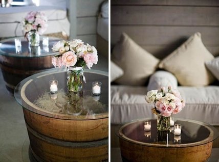 Из винной бочки, накрытой стеклянной столешницей получится очаровательный кофейный столик, который прекрасно впишется в интерьер в стиле прованс или кантри.