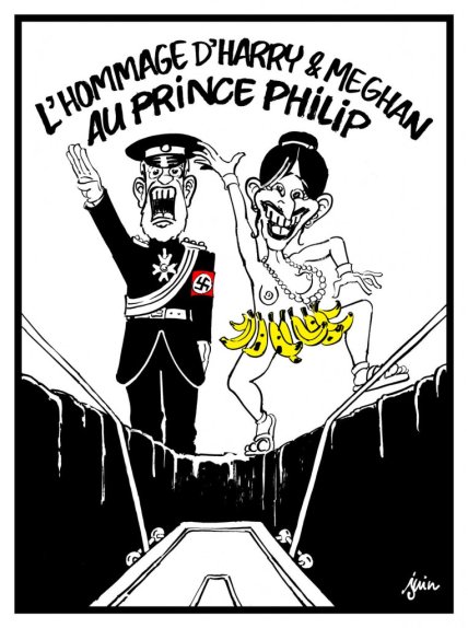 Журнал Charlie Hebdo опубликовал карикатуру на смерть принца Филиппа, в которой принц Гарри изображен в фашисткой форме, а Меган Маркл - с бананами.