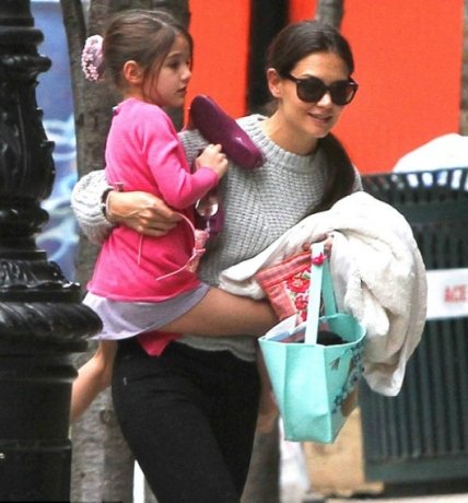 Днем ранее Кэти Холмс и Сури были замечены возле балетной школы, где девочка берет уроки танцев. На фото видно, что Кэти по-прежнему носит взрослую Сури на руках.