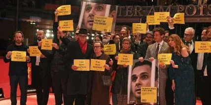 На международном кинофестивале Berlinale творческая команда фильма о британском свидетеле Голодомора "Мистер Джонс" вышла с лозунгами "Освободите Сенцова!".