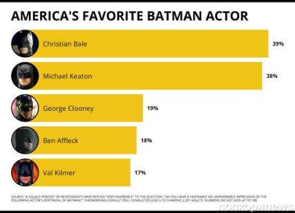 Среди остальных Бэтменов любимцем публики оказался Кристиан Бэйл - звезда супергеройской трилогии Кристофера Нолана. Что примечательно, Майкл Китон уступил ему всего 1% голосов.