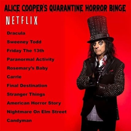 Винсент Дэймон Фурнье, он же легендарный шок-рокер Элис Купер поделился списком хорроров для просмотра на Netflix во время карантина.