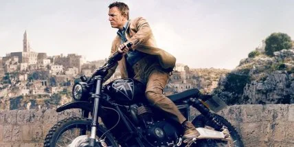 В сцене Джеймс Бонд взлетает по семиметровому трамплину и перепрыгивает через стену на мотоцикле на скорости более 95 километров в час.