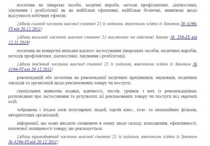 Если обратиться к Закону Украины "О рекламе", а именно к статье 21 о рекламе лекарственных средств, медицинской техники, методов профилактики, диагностики, лечения и реабилитации, то мы видим, что в рекламе лекарства нарушается сразу несколько пунктов из закона.