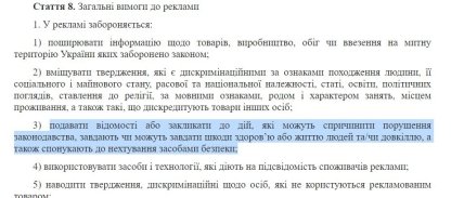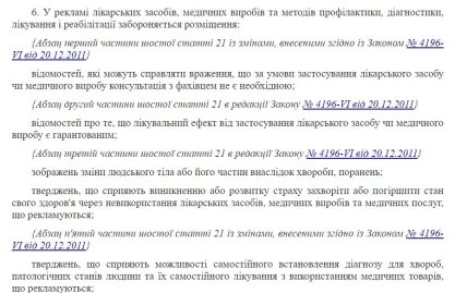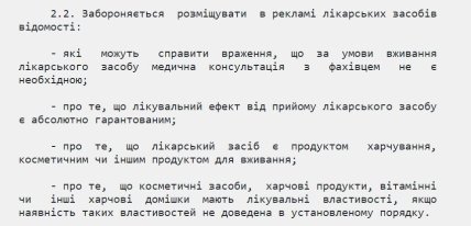 Также, если обратиться к указу МОЗ Украины "Об утверждении нормативных актов по вопросам рекламы лекарственных средств", то там говорится, что запрещено рекламировать лекарство так, что будет создаваться впечатление, что консультация с врачом не нужна. Об этом также говорится и в статье 21 закона Украины "О рекламе".