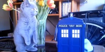 Видеосюжет о знакомстве котенка породы русский голубой с легендарным космическим кораблем TARDIS из известного британского телесериала "Доктор Кто" развеселил сторонников самого продолжительного научно-фантастического кинопроекта.