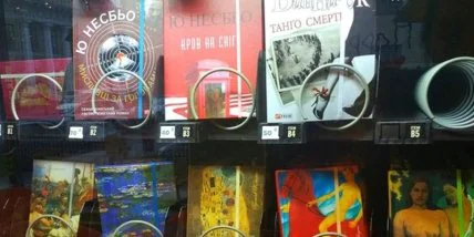 Обычный с виду автомат предлагает отличный перечень книг - новинки, бестселлеры, биографии Майкла Джексона или Уинстона Черчилля, пьесы Леся Подервянского, блокноты с картинами Климта или Репина, а также миниатюрные кулинарные книги.
