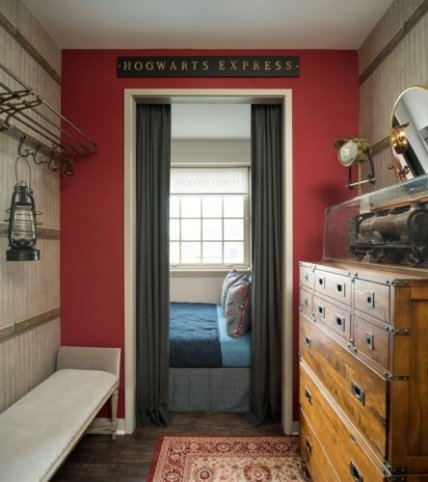 Просторная спальня выполнена в стиле факультета Гриффиндор. Ее потолок создает иллюзию летающих свечей. А вторая спальня напоминает пассажирский вагон Хогвардского экспресса.