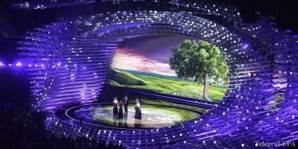 Полина Гагарина из России поразила публику не только вокалом, но и светящейся инсталляцией на подоле белого платья.