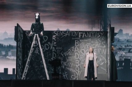 Нас сцене представительница Азербайджана - Dihaj с мощной песней Skeletons. И да, вы не ошиблись, с лошадью на лестнице :)