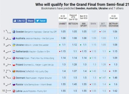 На сайте международного песенного конкурса Евровидение появились оценки букмекеров, которые определили, кто пройдет в финал в 2018 году.