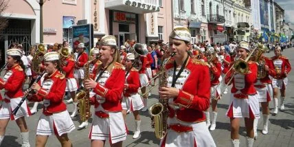 В четверг они утром прошли праздничным марш-парадом по главной улице города Сумы Соборной, после чего разошлись по разным локациям города, где выступают перед горожанами.
