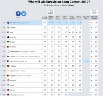 Такие данные пока сложно назвать объективными, ведь большинство стран до сих пор проводят нацотбор и определяются с именем победителя. Поэтому пока нет полного списка песен и артистов, которые будут претендовать на главный кубок Евровидение-2019.