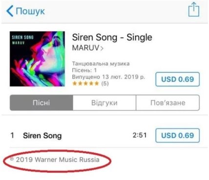 Владельцем прав на песню Siren Song, с которой певица MARUV планирует представить Украину на Евровидении-2019, является российская компания Warner Music Russia. Поэтому можно предположить, что все лицензионные платежи от исполнения песни пойдут в российский бюджет.