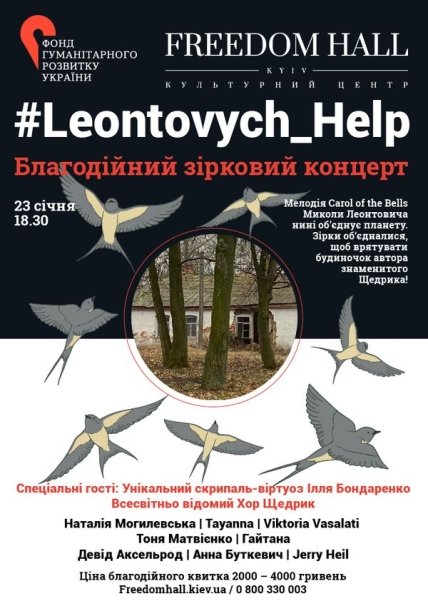 23 января в Freedom Hall состоится большой благотворительный концерт для спасения от разрушения уникального объекта культурного наследия - дома Николая Леонтовича. Наталья Могилевская, Тayanna, Тоня Матвиенко, Jerry Heil, Viktoria Vasalati, Анна Буткевич, Дэвид Аксельрод, Гайтана споют в этот вечер на благотворительном концерте, чтобы собрать средства на восстановление заброшенного дома семьи композитора в селе Шершни Винницкой области. Благотворительную инициативу также поддержат своими выступлениями всемирно известный хор "Щедрик" и один из лучших в мире скрипачей-виртуозов Илья Бондаренко.