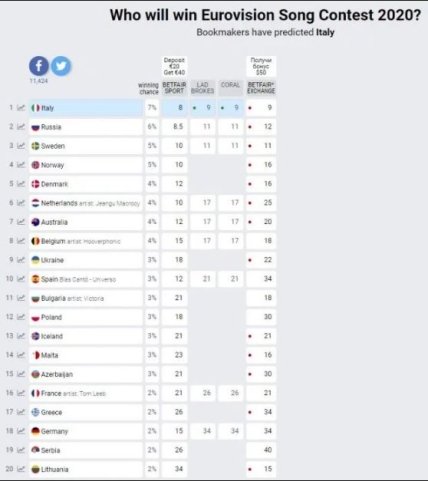 Евровидение 2020: какой стране букмекеры пророчат победу