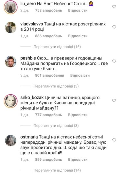 «Циничная ватница», «Лучшего места не было», «Слышу звук пробитого дна», «Дно полное...», «Насколько надо быть циничной, чтобы выпускать такое за день до годовщины Революции Достоинства?», «Позорное пятно на всю вашу жизнь» - пишут в комментариях.