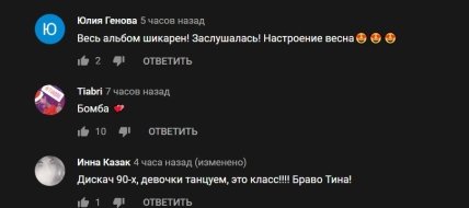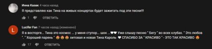 "Я в восторге... Тина это космос ... у меня ступор... шок", "Это бомба", "Весь альбом шикарен! Заслушалась! Настроение весна", "Уже слышу песню "Бегу" во всех клубах", "Необычно и очень круто, Тиночка- умница", "Очень красиво", "Это очень круто, просто что-то нереальное" - пишут под видео.