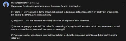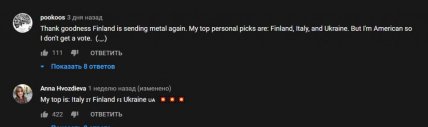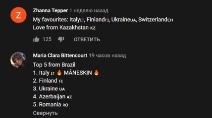 Под видео зрители из разных стран написали свои впечатления от песен, некоторые составили свои "топ-5" стран, а одни и вовсе назвали победителя по их мнению. Соит отметить, что международная группа поддержки у Украины достаточно большая.