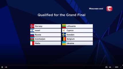 Итого, 10 финалистов выглядит таким образом: Норвегия, Израиль, Россия, Азербайджан, Мальта, Литва, Кипр, Швеция, Бельгия и Украина.