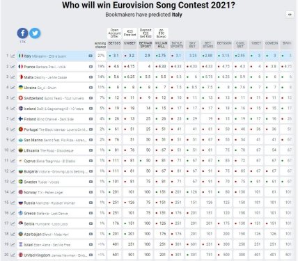 23:49 - На сцене главный фаворит букмекеров - группа из Италии Måneskin с песней "Zitti E Buoni". Отметим, что группа занимала первое место в таблице букмекеров напротяжении нескольких недель.
