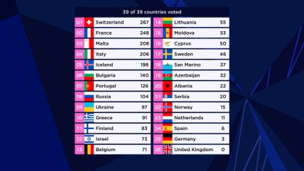 01:32 - Ведущие объявляют результаты голосования зрителей. Четыре страны получили по 0 баллов от зрителей: Великобритания, Германия, Испания и Нидерданды.