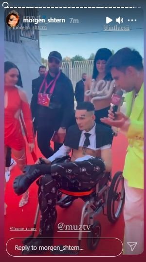 Своим появлением рэпер привлек к себе внимание. 23-летний парень приехал на премию в инвалидной коляске и в необычном "обрезанном" костюме.