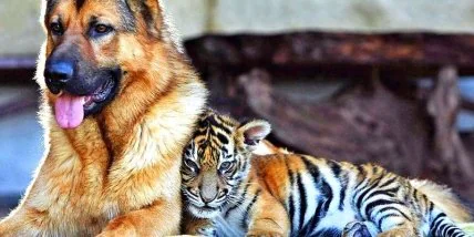 Вы будете под столом: знакомство овчарки с игрушечным тигром (Видео)