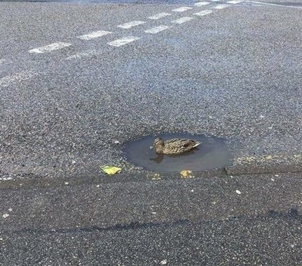 Этой уточке пофиг, что она сидит в луже посреди дороги