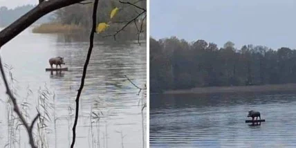Соцсети взбудоражили странные кадры, на которых дикий кабан плывет по реке на плоту. Фотографию облюбовали сотни человек, около тысячи раз ею поделились.