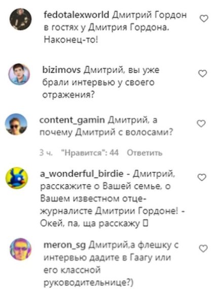 Пользователи сети на такую новость отреагировали с юмором, спросив, не брал ли Гордон интервью у своего отражения, а также почему его сын не лысый.