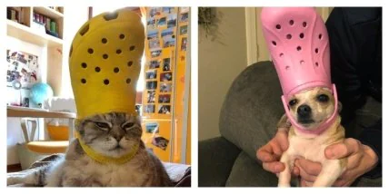Однажды кто-то додумался нацепить кроксы на голову своему любимому питомцу и получилось очень помпезно. Эту идею подхватили в сети, и некоторые животные стали ненавидеть своих хозяев еще больше.
