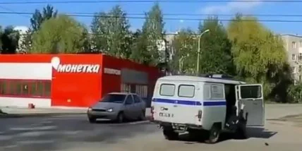 Инцидент попал на видео. На нем видно, что на повороте, после того как служебная машина пропустила скорую, из автомобиля УАЗ с надписью "полиция" выпадает мужчина в форме. После произошедшего он сам встал.