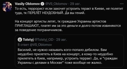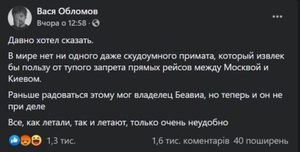 На своей странице в Фейсбуке Обломов возмутился, что прямые рейсы между Москвой и Киевом отменены, и ему видимо было не совсем удобно добираться на свой концерт. Запрет перелетов он назвал "тупым" и добавил, что все "как летали, так и летают, просто очень неудобно".