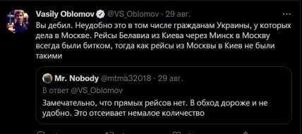 Возмущенному Васе Обломову напомнили о причинах запрета прямых рейсов между Москвой и Киевом.