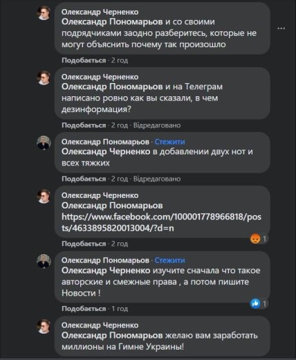 Пользователь Фейсбука Александр Черненко у себя в посте обратился к Пономареву, попросив объяснить эту ситуацию, ведь в музыкальном издательстве "Best Music", сообщили, что аранжировка гимна Украины Пономаревым считается отдельной композицией и права на нее принадлежат ему.