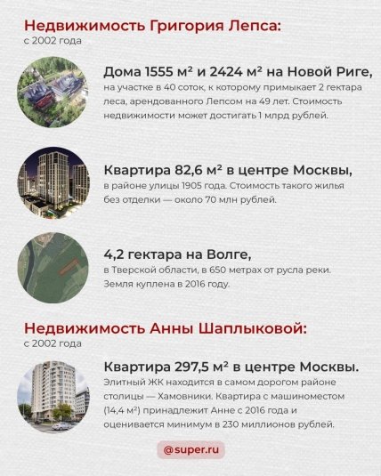 Super.ru также отмечает, что в собственности певца также есть два дома площадью 1555 и 2421 кв. м, расположенных на участке в 40 соток в поселке "Третья охота". Стоит отметить, что к участку Лепса примыкают 2 га леса, которые он арендовал на 49 лет. Telegram-канал пишет, что стоимость домов в этом районе составляет около 1 млрд рублей.