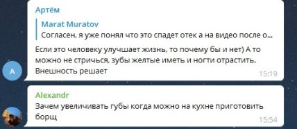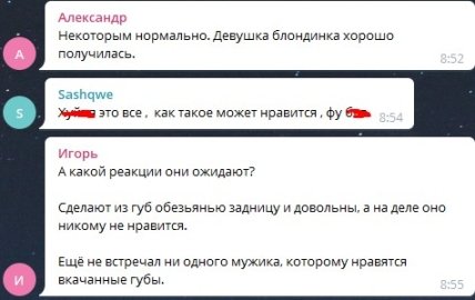 Отметим, что большинство комментаторов солидарны с мужчинами из роликов, не понимая, зачем женщинам нужны подобные процедуры. Кто-то считает, что в этом нет ничего страшного, и каждый имеет право на скрывание каких-то изъянов своей внешности. Примечательно, что при этом некоторые из юзеров свято уверены, что это "некрасиво" — менять женщине внешность "без спросу мужчины".