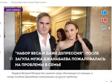Экс-солистка "ВИАГры" Альбина Джанабаева и 56-летний певец Валерий Меладзе, который ранее попал под волну критики за свое выступление на украинском вокальном шоу "Співають всі", уже почти 20 лет вместе. За это время им уже не раз приписывали расставания, разводы и многочисленные измены, но пара по-прежнему вместе. Более того, в апреле 2021-го года Джанабаева родила Меладзе дочь. Однако СМИ не устают "разводить" артистов.