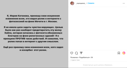 Прокомментировать свою причастность к фотосъемке у мечети таркетолог Мария не смогла, но спустя время она опубликовала у себя в Инстаграме пост с извинениями.