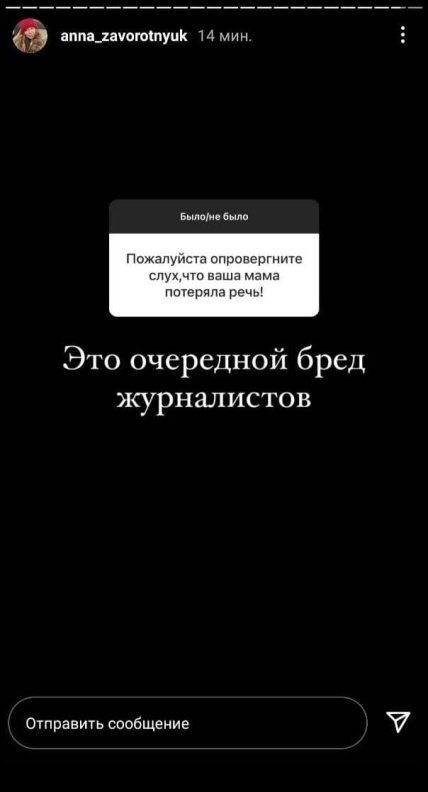 Старшая дочь Заворотнюк Анна на своей странице в Инстаграме сразу же опровергла эту информацию. У себя в соцсети девушка как раз проводила опрос среди своих подписчиков, и один из ее поклонников поинтересовался, являются ли эти слухи правдой.